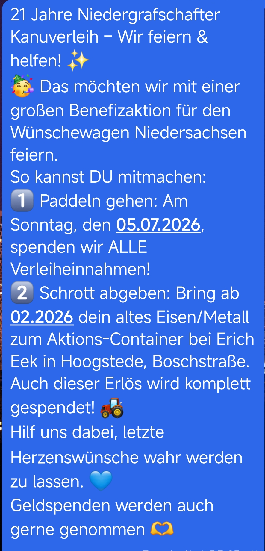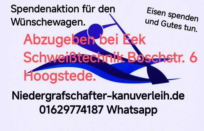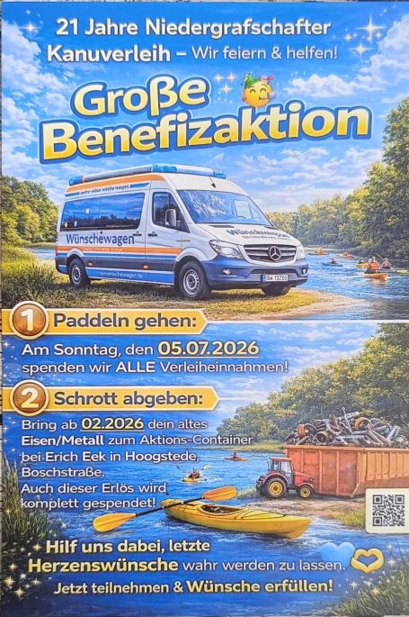 Zum Abschluss am 05.07.2026 findet eine Kanufahrt gegen eine freiwillige Spende statt. Dieser Betrag wird ebenfalls komplett gespendet. Die Tour führt um ca, 12 Uhr von Hoogstede nach Emlichheim.